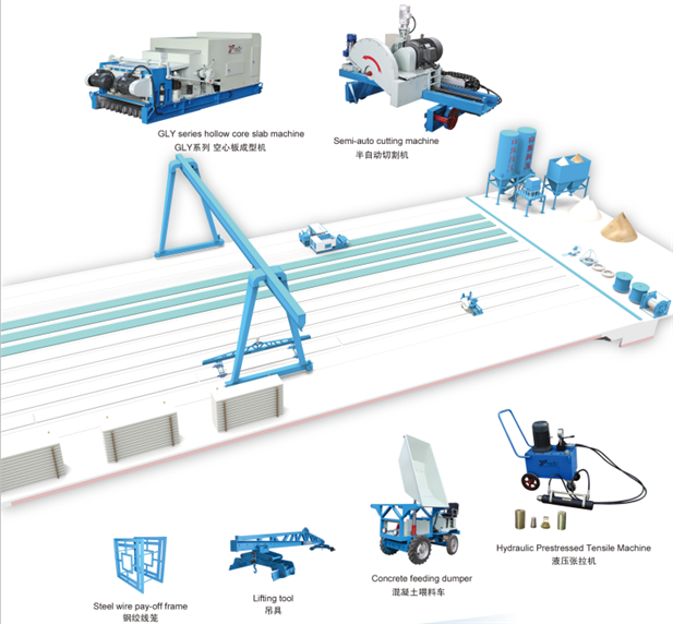 山東興玉機械科技有限公司專業研制、生產預應力混凝土預制構件成型機械的專業廠家,本公司生產的GLY預應力混凝土空心板成型機-樓板機(非圓孔、圓孔)具有設計合理、操作簡單、維修方便、易損件壽命長等特點。所產出的空心板材表面光滑,結構密實,強度及幾何尺寸均能符合國家有關規范要求,制板長度可由4.2米至18米,板寬為600mm、900mm、1200mm,板材厚度為120mm、150mm、180mm、200mm、250mm、300mm、380mm,是大開間廠房、學校、醫院、商場、辦公樓大型倉庫及民用住宅等所用跨度大、承載高的空心板材經濟、理想的生產設備。